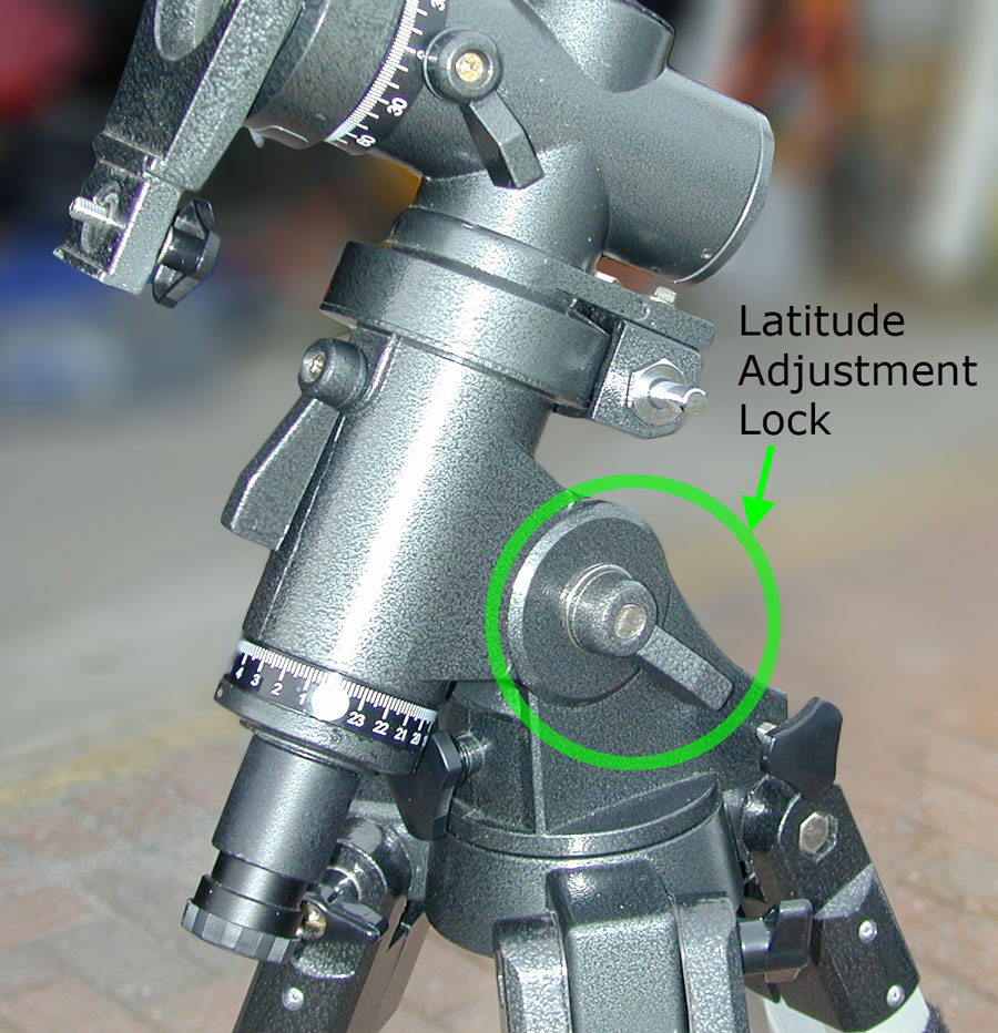 There is usually also a scale somewhere showing the current elevation of the polar axis in degrees. The elevation is usually set to your latitude on Earth (or close to that, adjusting for lack of levelness in the mount), so this is generally called the “Latitude Scale”. We’ll discuss this when we discuss polar alignment.