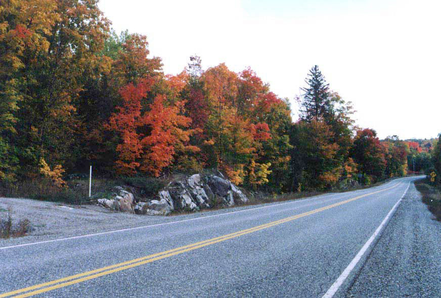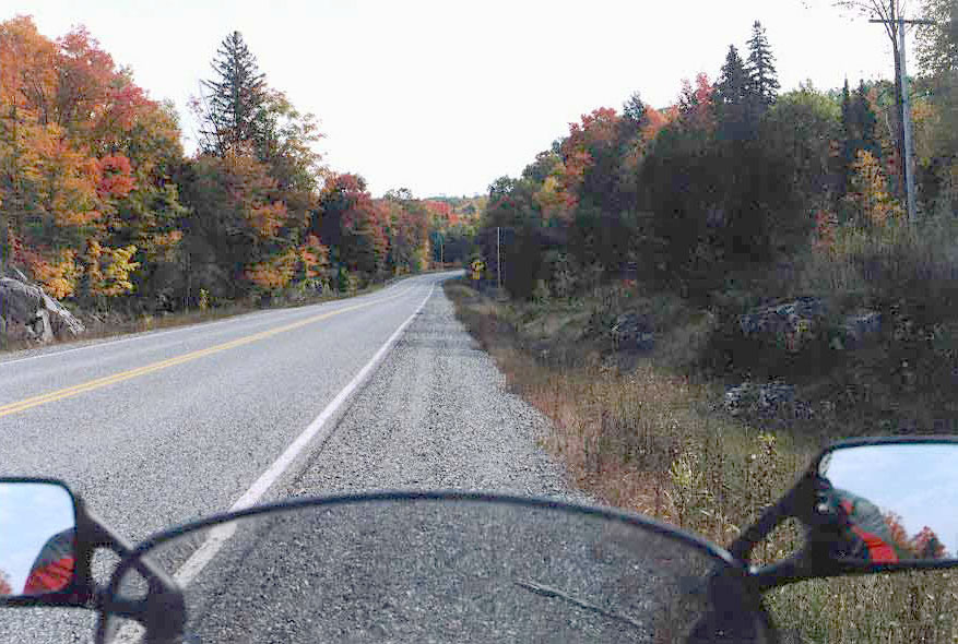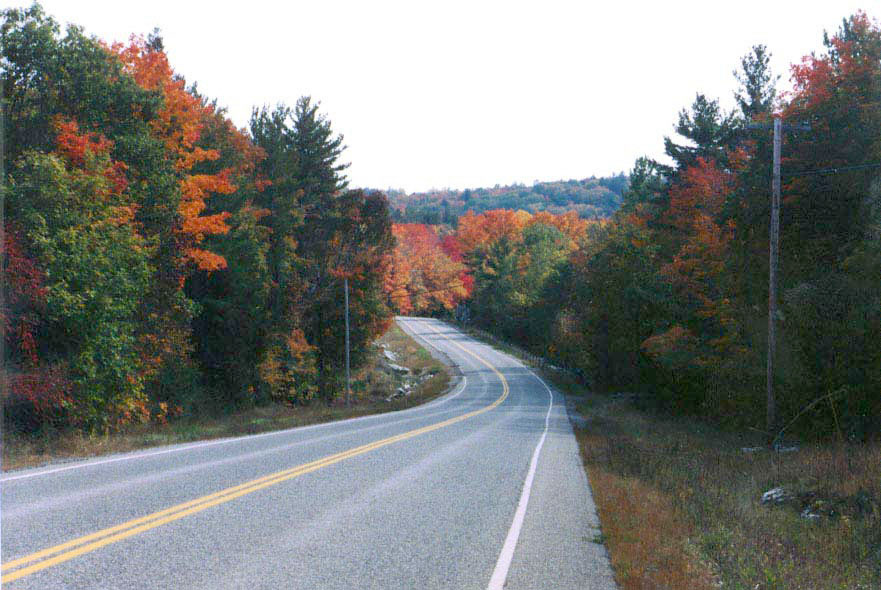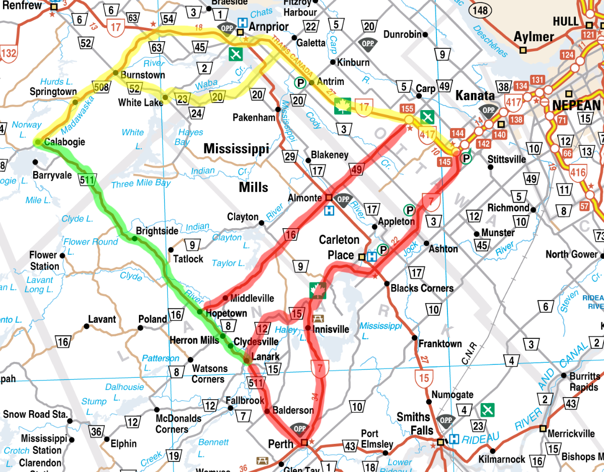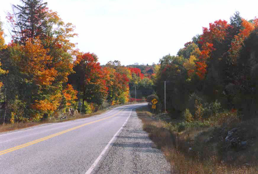 This is a quiet regional highway. Frequently used by motorcycles and some local traffic, but never very busy. Two lanes of good pavement. A few tight turns and continuous interesting sweepers. Travels through wooded lake country and rolling farms. Many maple trees yield spectacular colours in autumn. Gas and rest breaks available at Lanark, Perth, Calabogie.