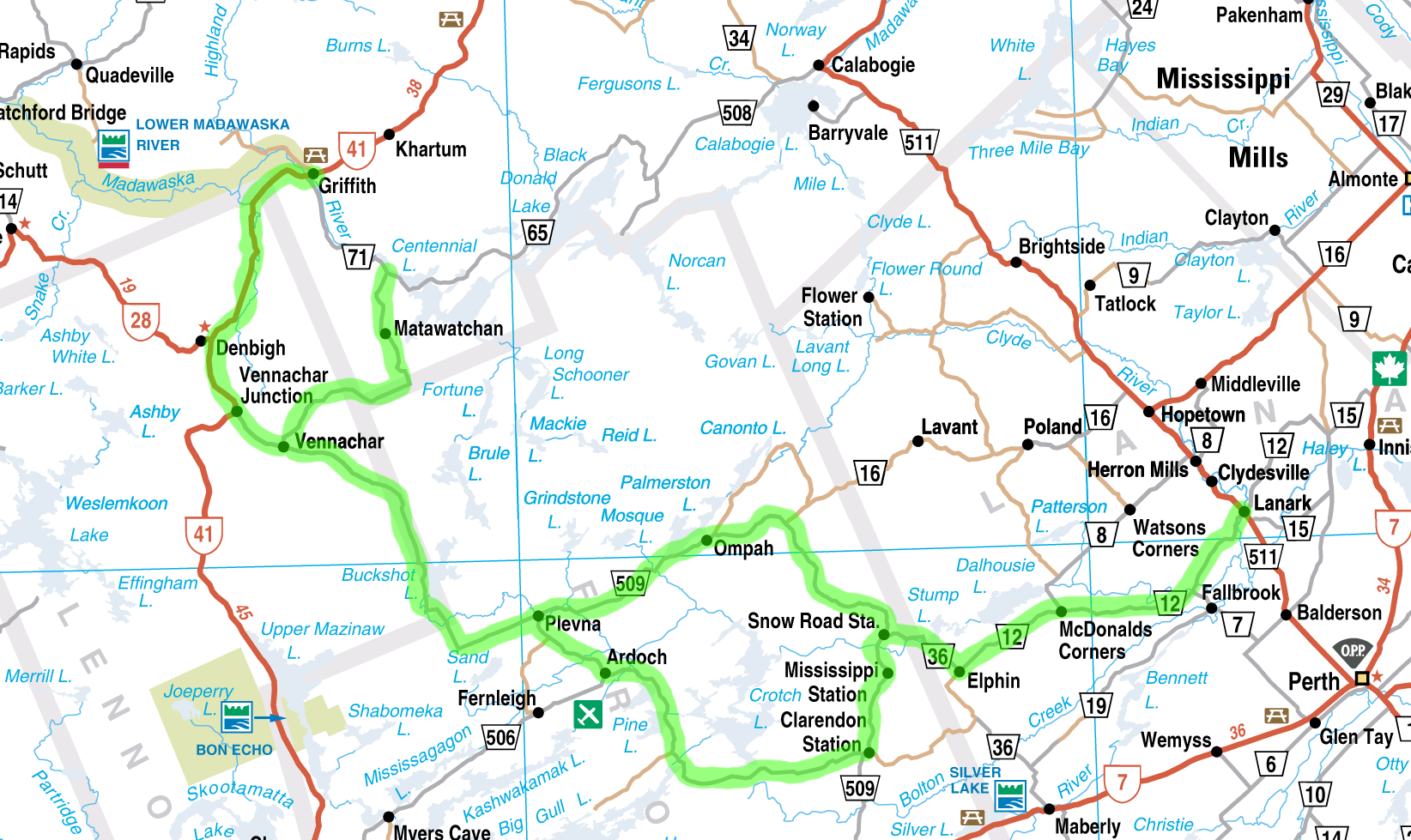 The “Ompah-Plevna” area is a large loop including the towns of Ompah, Plevna,